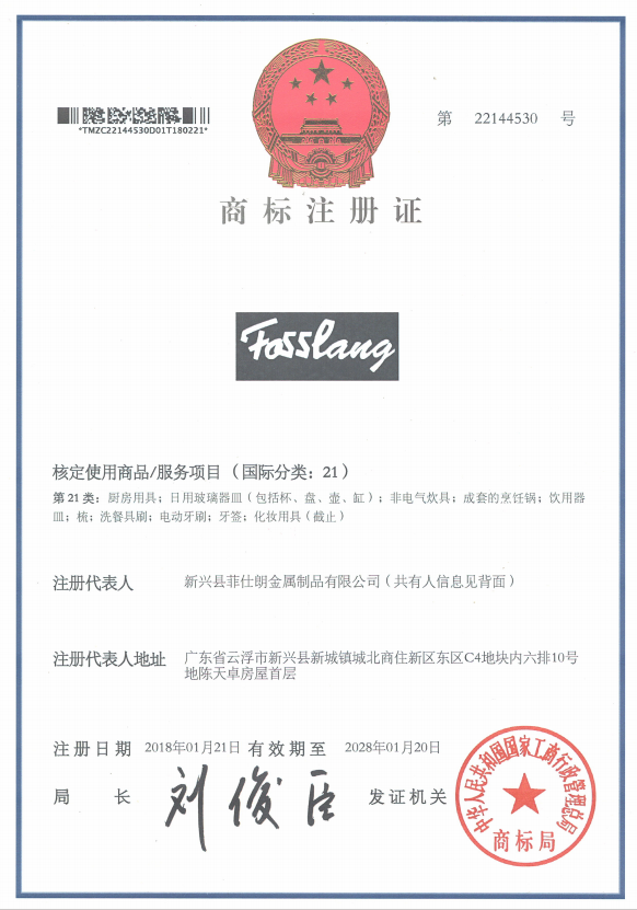 Issuing Entity (Licensor): Xinxing County Fosslang Metal Products Co., Ltd. (the legitimate owner of the “Fosslang” brand, engaged in the production and distribution of metal products)